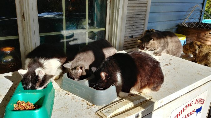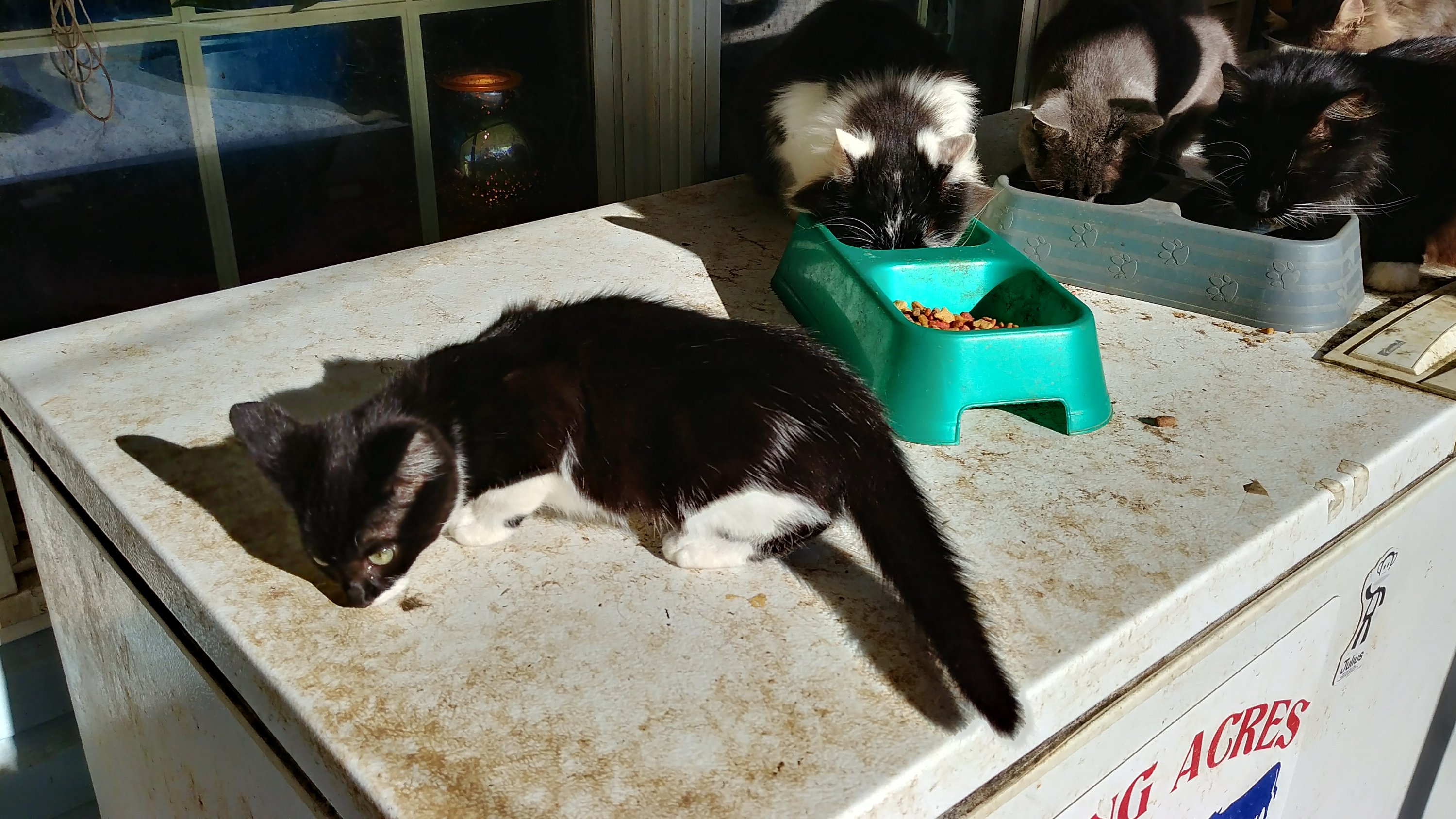 Rory loves everybody and wanted to love her too, but the little kitten was already hissing and had her back up, and he decided he wanted none of that. He kept trying with her, but every time he would get even close to her she would hiss and growl at him. Eventually he backed off so he could go eat breakfast in peace.