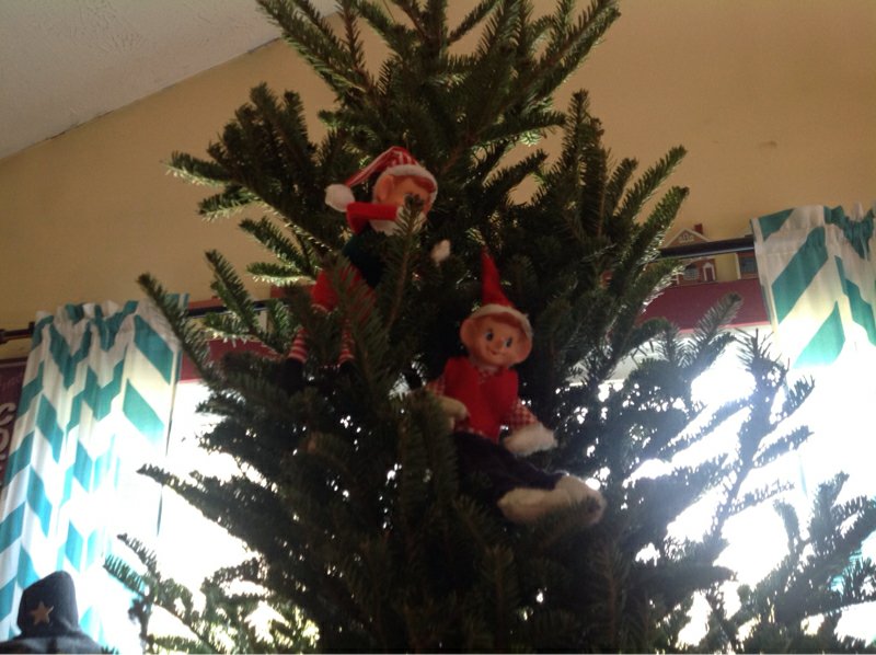 Janeesa came home on Saturday for a visit, and there were so many family members here to see her in the living room all day that the elves just couldn’t move without being seen. Jake was so happy when he came in this morning and found that they climbed the Christmas tree between Saturday night and Sunday morning! He’s now busy making them a bed so they will be comfortable at night from now on during this visit.