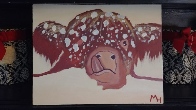 My daughter-in-law, Morgan, painted this picture for me! I love it! The little bull in the picture is licking at snowflakes that are falling, and he looks just like our bull, Chip!