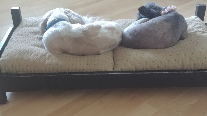 Chewie is still adjusting. He finally has agreed that biting me that one time on the big toe because I was trying to make him go outside to pee was unacceptable, and after a little training he’s learned that barking during our mealtimes doesn’t get him a little bite but sitting quietly always earns him a few. He’s learned to stay off the furniture (except when he gets too excited and I remind him to get down), and he’s learned from Smidge to sneak onto the couch to peek out the front door window when we’re not home/outside doing yard work (Yes, Smidge! I know you do it!!!). He’s been to the groomer and decided early on that he loves the dog food Smidge likes (as has Frito, Sahara’s cat, who will eat it all. day. long!).
