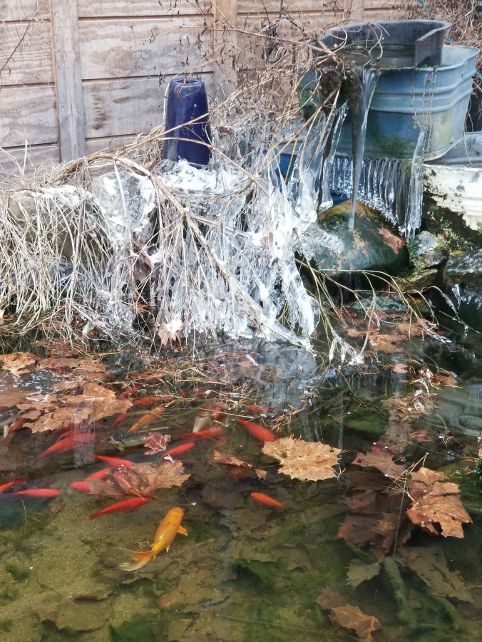 The little fish pond waterfall is barely trickling, and that is ice you see formed against the plants. The fish will slow down more and more until they finally settle in the bottom of the pond until warm weather comes in the spring.