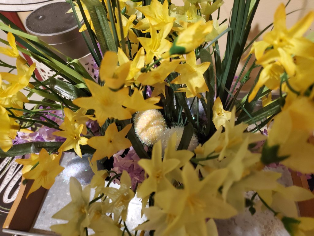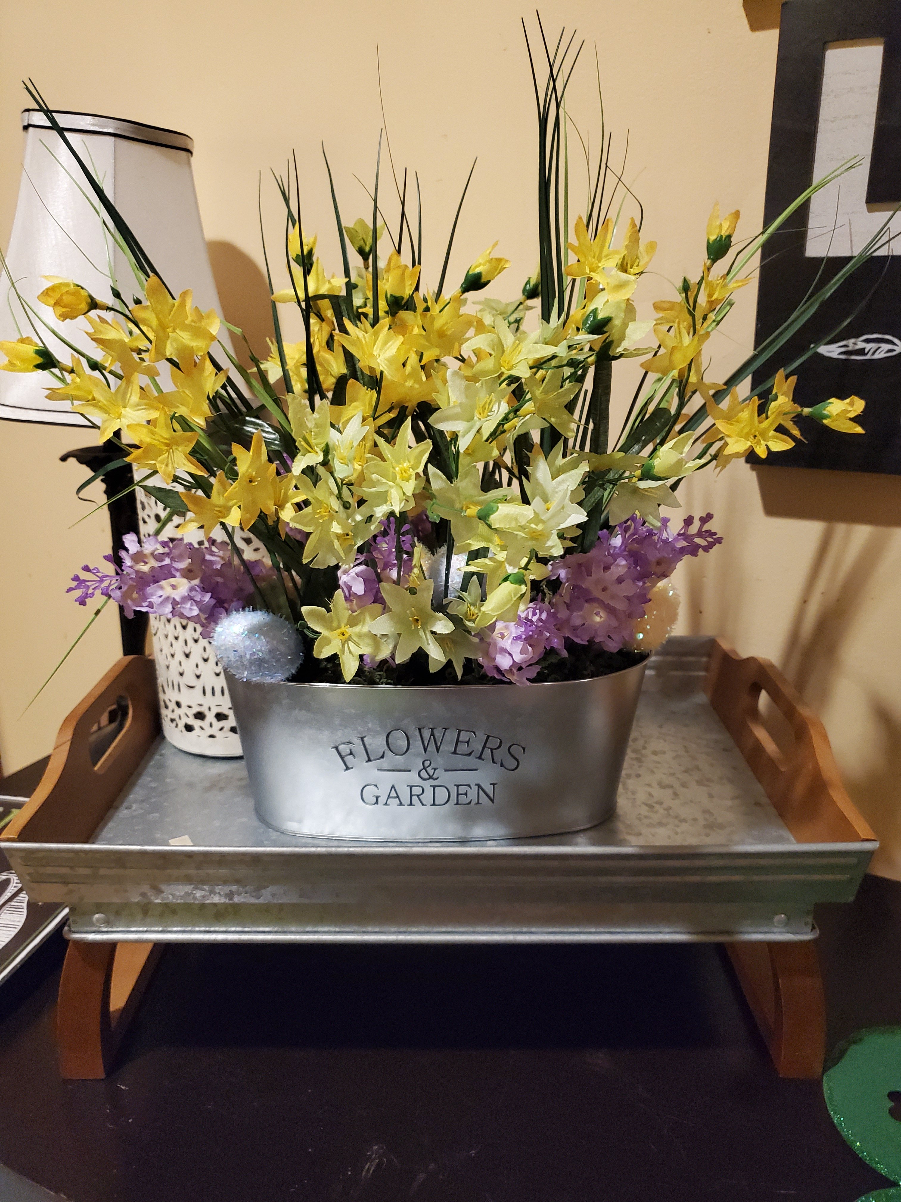 Everything is from Dollar Tree. It came to $11 total cost – 2 sprays of egg cattails (cut apart), 2 sprays of lilacs, 2 sprays of greenish flowers, 2 sprays yellow flowers, 1 metal bucket, 1 foam block, 1 bag moss (although if I ever make another I’ll shove bubble wrap into the spaces the foam block didn’t fill and use less moss)