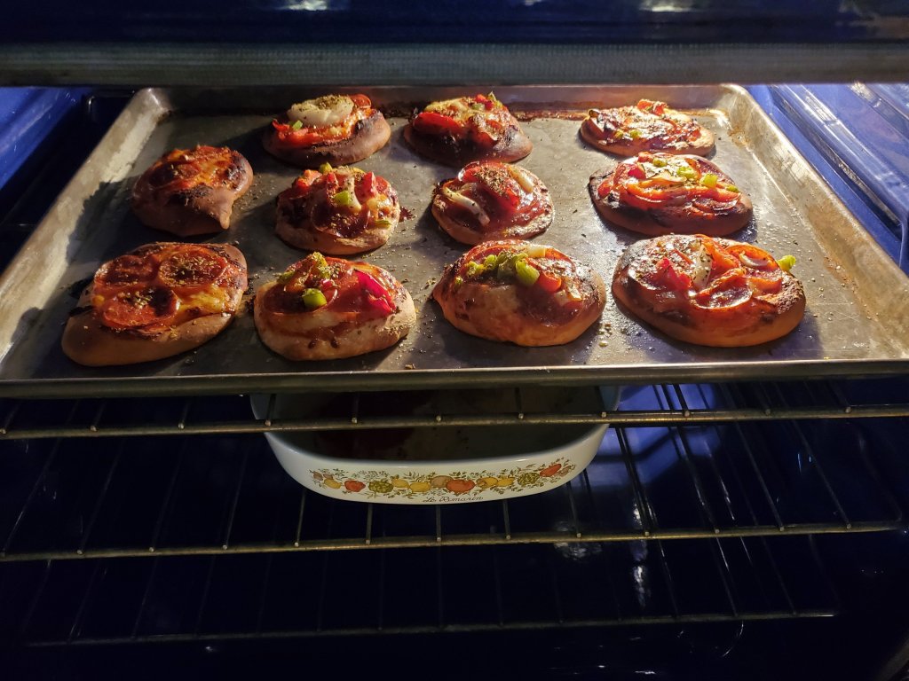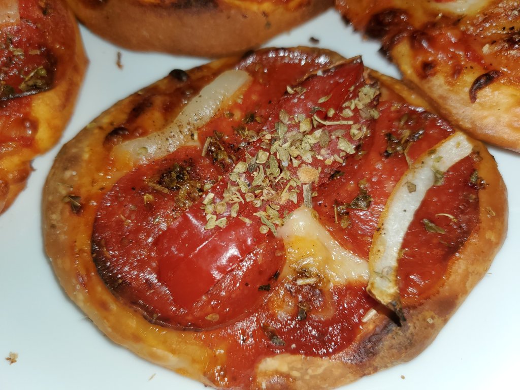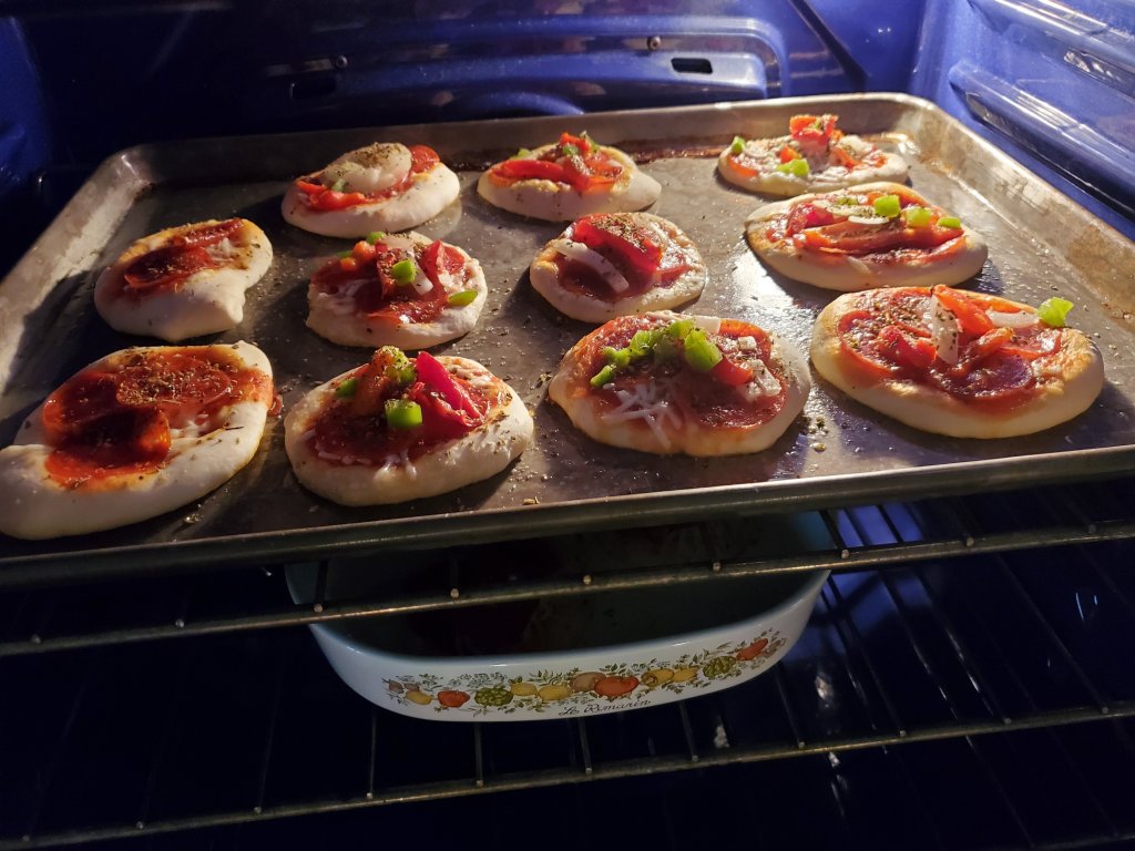 Add some sauce to each patted out dough circle (maybe a tablespoon) and then your toppings. I put on each one: cheese, pepperoni, a tsp of frozen peppers and onions, and a sprinkle of dried oregano, garlic powder, salt, and black pepper.