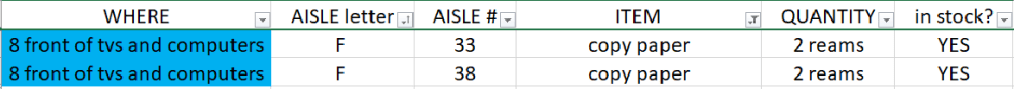 Fourth, look at the WHERE column and fill that in however you will best remember it. For instance, the printer paper in our Walmart is in two different aisles in front of the television/video game section of the store. My row for printer paper looks like this on my spreadsheet to help me remember exactly where it is while shopping (I numbered each WHERE section with how I flow through the store so I could sort quickly by section on my spreadsheet if necessary):