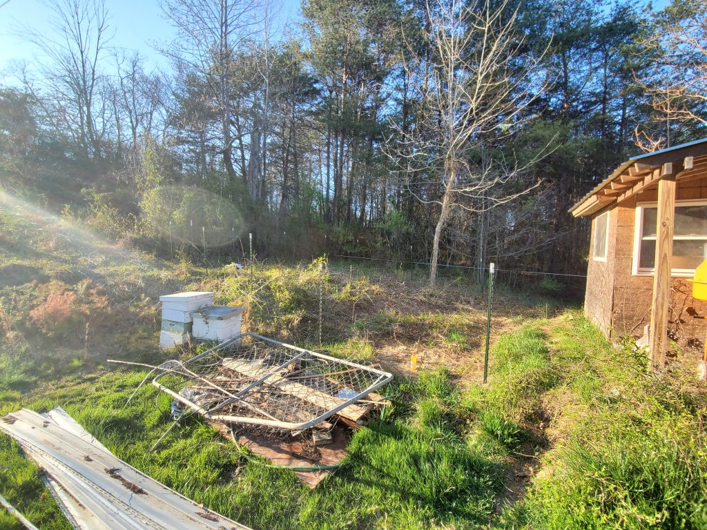 This is what the new spot looked like partway through his project on Saturday. He’s pulled into piles old junk that was just here, there, and everywhere. When you have a farm, you hold onto stuff because you never know what will come in handy for a future project. He’s pulled stuff out from under this building and from behind it and even inside it, and some of it came in handy while he was working on it. Now we just have to figure out what can be trashed and what should be stored away again.