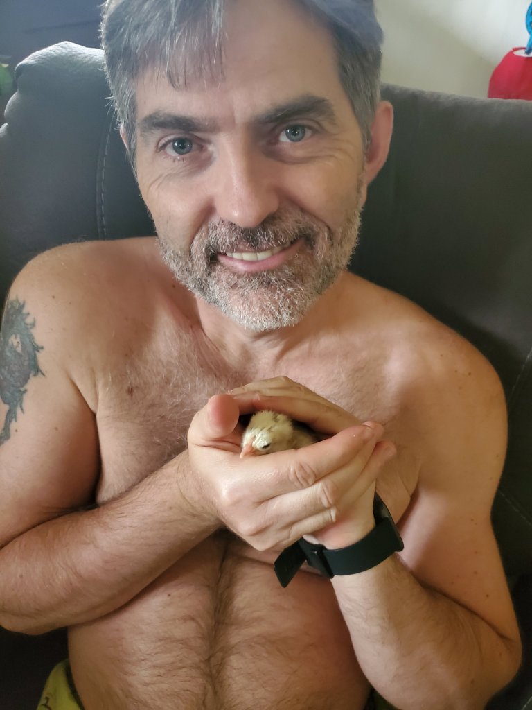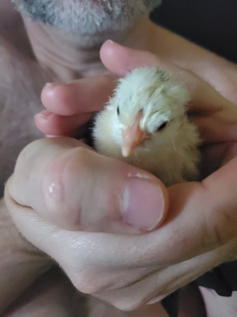 This little chick sat in Ted’s hands for hours yesterday (solitary chicks don’t do well at all).