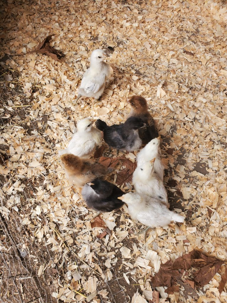 Out of the first incubator of 41 eggs, we had 25 healthy chicks hatch, three eggs pip but not zip (meaning those three chicks were able to peck a teeny hole in the egg but then died before doing anymore which happens for a variety of reasons), and 13 eggs were duds (not fertilized so no chicks from those). We kept them under a heat lamp in the living room in a trough since Easter Sunday, and they got moved to the broody coop out front over this weekend.
