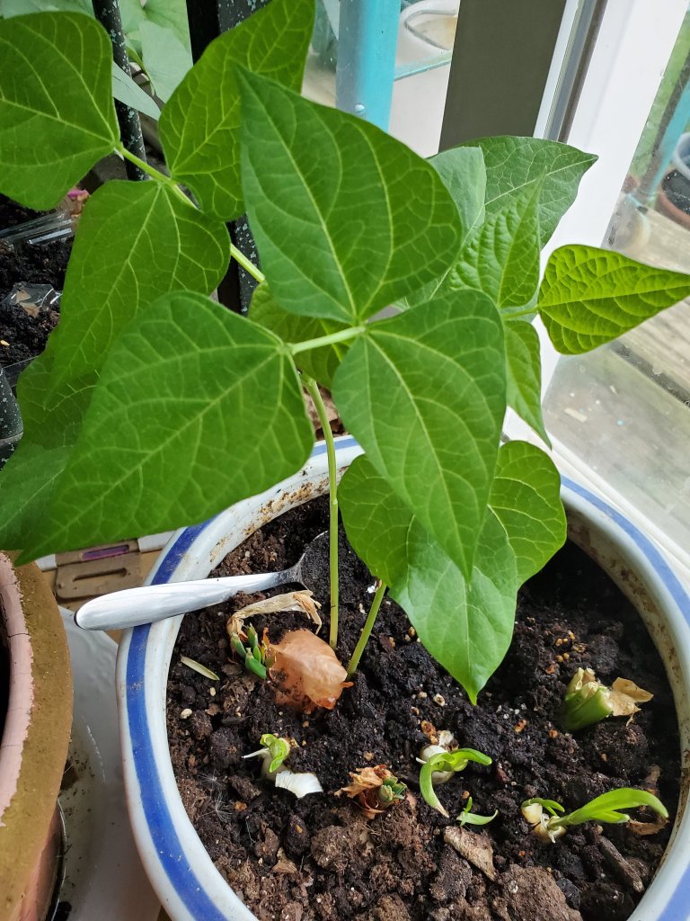 I was in her garage a couple of weeks before all this COVID-19 shutdown started, around the time I needed to plant those potato eyes, and I saw this ceramic pot of dirt setting back in the corner amongst a bunch of odds and ends. I asked my Dad if I could take it because I’m always looking for planters and pots, and he said yes so I did (I’m turning into the eccentric plant lady now…). I brought it home and planted the potato eyes in it, and the potato eyes grew so I stuck those out in the garden a few weeks ago. Then I stuck some onion tops that turned green and some garlic in it just to get some green onions going for cooking and some more garlic going for the garden. Low and behold, something that she had planted in this pot evidently got warm enough or hit the right time of the year or got enough water or something, and it sprouted and then started to grow!