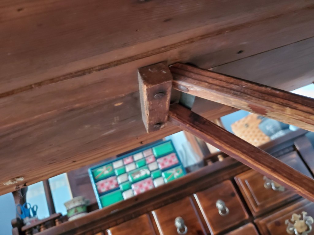 Did you ever have an ironing board fall apart at the hinged metal part of the legs? This will never happen with this ironing board. I’d literally have to break the legs for this to be rendered unusable. This is the part on the bottom that catches the legs. The entire thing is wooden as is the rest of the ironing board other than the nails in it and that little metal bracket that holds the legs together right there and one long wire piece that allows the legs to slide up/down. I don’t think this ironing board will ever give out. Ted has used it for over 20 years to iron his clothes; I found an ironing board cover and pad, and we put it on here to use it with the steam iron (it’s off right now as I threw it in the washing machine).