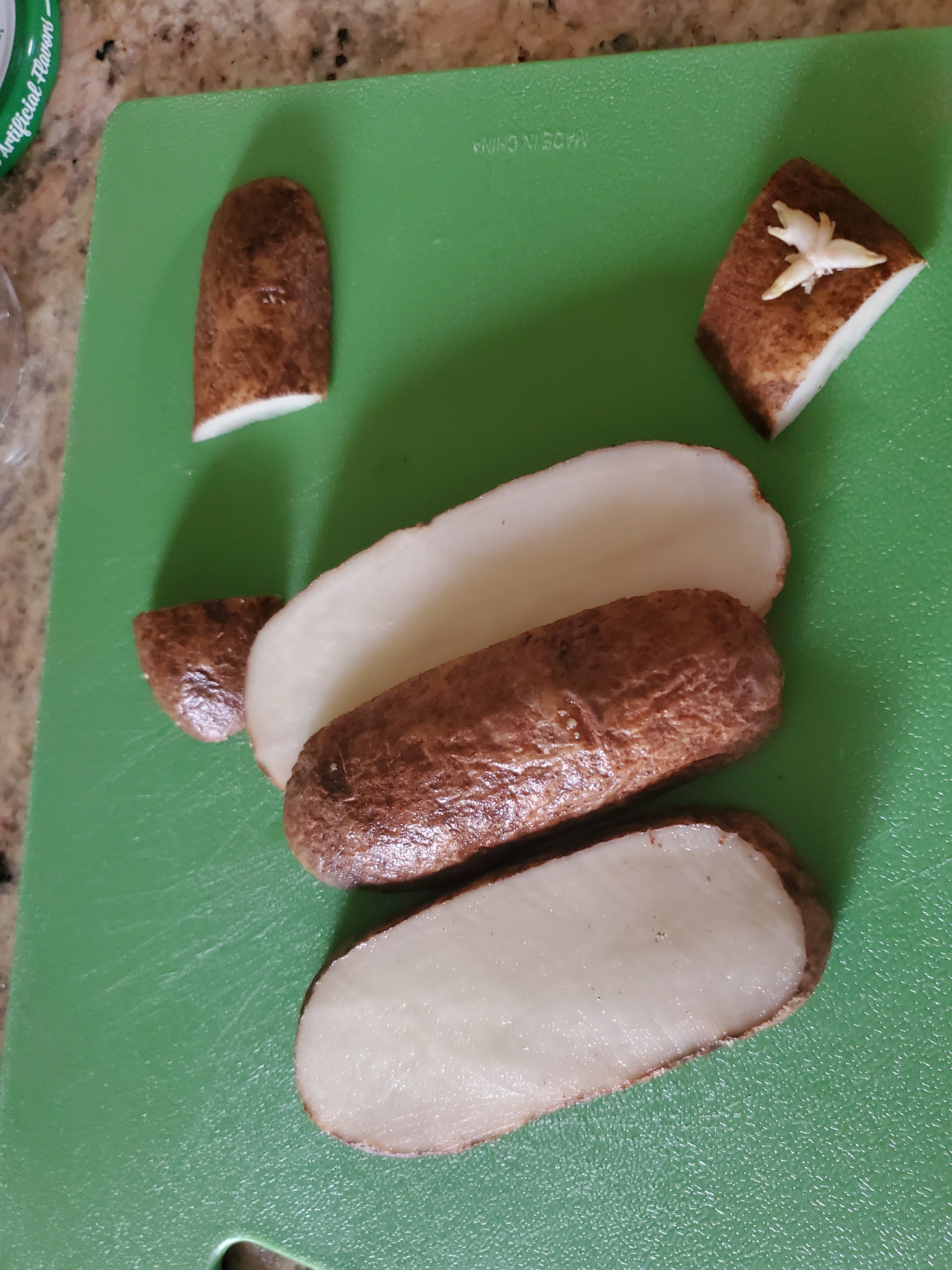 …and in half again. Here you can see i cut out the eye and set it to the side to plant tomorrow.