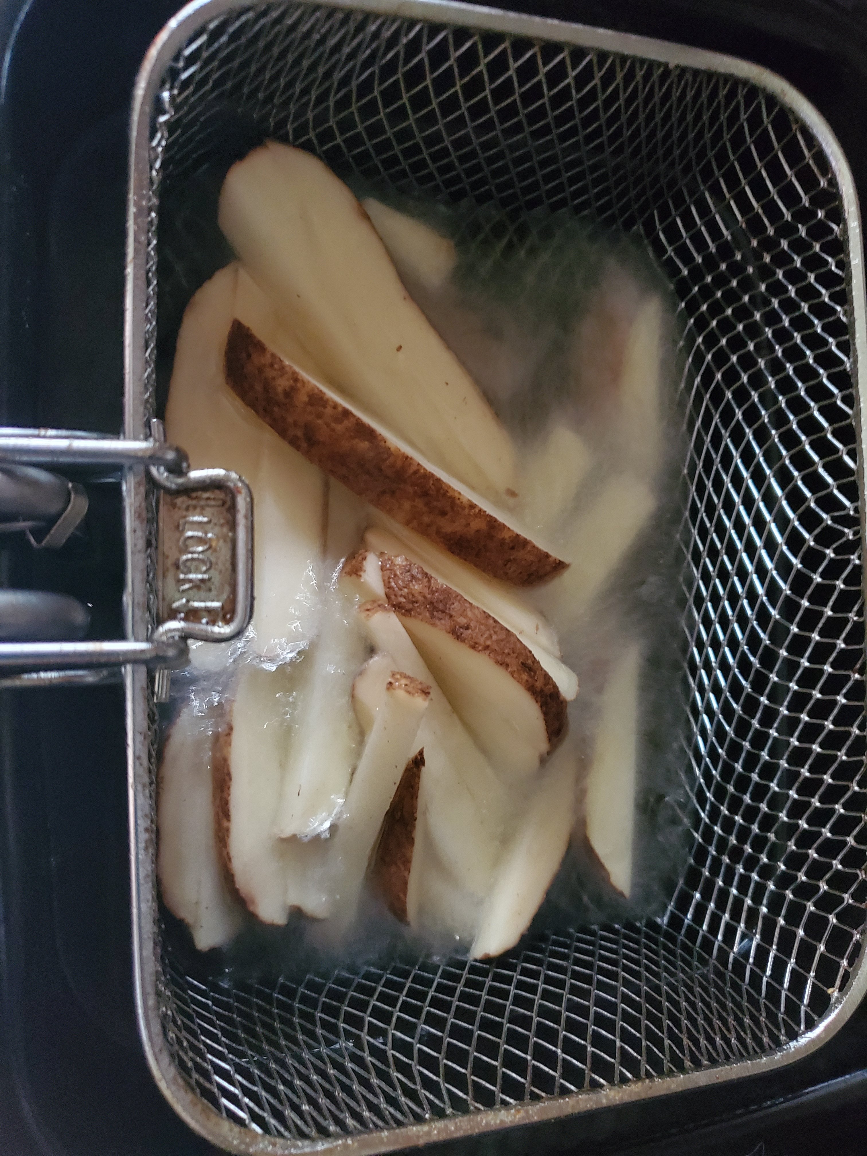 There are various ways to cook fries: deep fry (to taste like a restaurant), air fry (for a healthier option), or bake (in wedges like usually gets served with steak). In this example, I’m going to deep fry these.