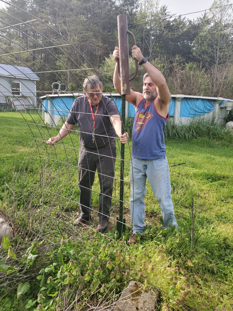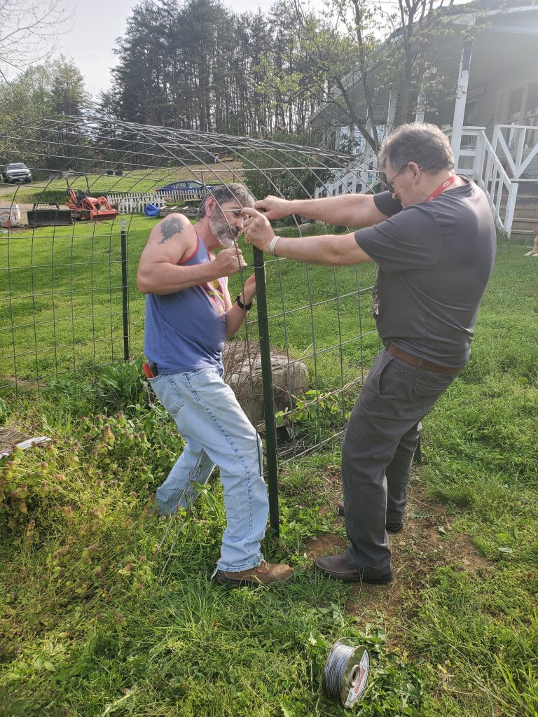 Monday was beautiful weather here. Ted mowed the big field at the church, and before he started I asked him if he could cut me down a cattle panel from the old pig fence, and he said he would when he came back. He did, and then my Dad and Ted installed the panel and four posts as a garden arch for me.