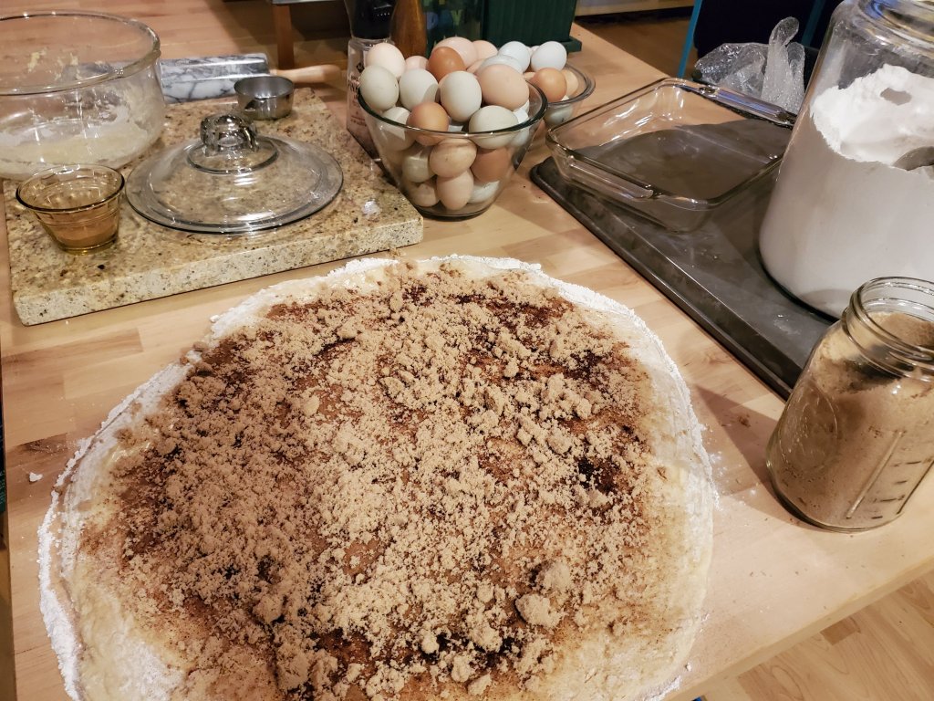 Then roll the dough out on a floured surface and spread 1/4 cup of melted butter (not margarine!) on the dough and then top that with 1 cup brown sugar and 1 Tbl cinnamon sprinkled over the buttered dough. Roll the dough up, cut it into 12 slices with a sharp knife, put the cinnamon rolls in a buttered baking dish, and follow the rest of Billie’s roll recipe to rise for the second time and then bake as her recipe says.
