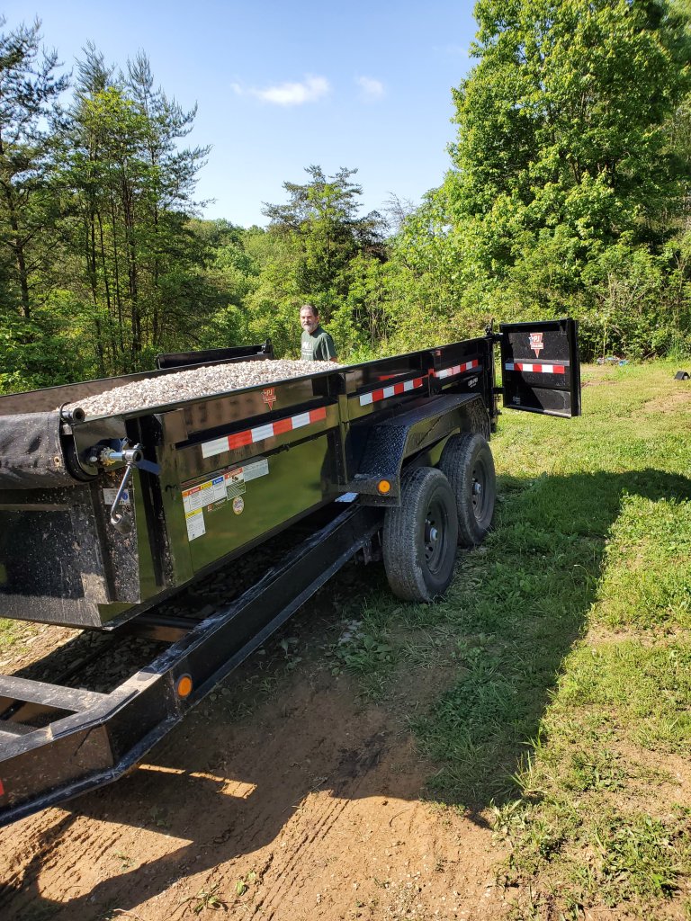 Then we head home, dump the gravel (the dump trailer has a little remote that raises and lowers the end of the trailer nearest the truck so the gravel just slides out the back end), and then Ted uses the tractor to spread the gravel out.