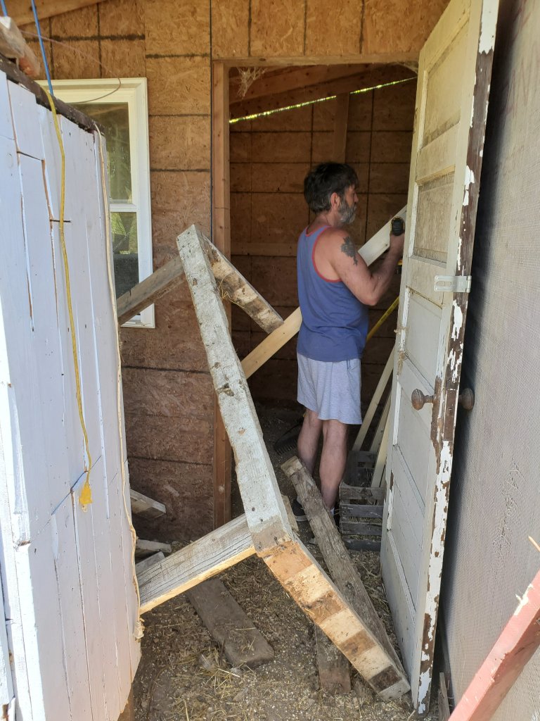 Ted built a little roost for the fat white hen. She is old and can’t get up on the higher roosts anymore, and she prefers to keep to herself. He wanted her to not be bottom of the flock just because she got old, so he built this little perch for her to boost her self-confidence and make her happy.