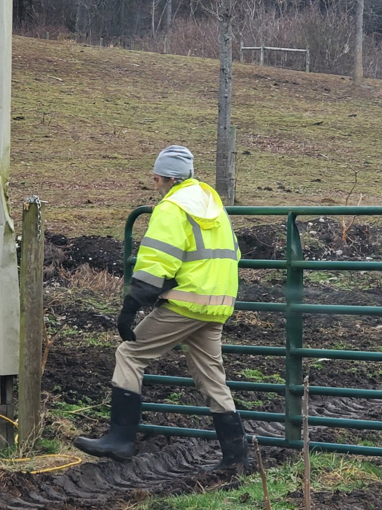Ted going in to get the cattle to one side of the pasture so he can drive in a big round hay bale without worrying about a cow coming out the gate hereThe hay is in so now to secure the gate to keep people from opening it.Ted has to run the extension cord back again to the water trough heater so their water doesn’t freeze. The cord also has to be anchored so they can’t accidentally pull it into the water.He puts a feed bag over the two cords where they connect to keep water off of them.Ted picking up baling twine he cut off the round hay bale. Cattle can die from ingesting it so he almost always cuts this off before he takes the hay bale into the pasture. Heading back home to plug in the tractor so the block doesn’t freeze because IT IS COLD HERE!