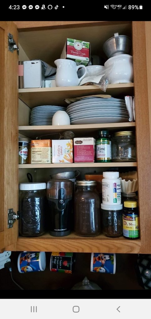 I opened this cabinet to make a cup of tea, and it hit me that I don’t really use much of what’s in here anymore. I decided I’d meet my New Years resolution of decluttering seven items weekly to donation or trash by completely going through this cabinet. I also wanted to make a spot for the popcorn maker to get it off the countertop.