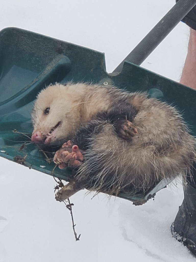 Ted was able to push the opossum back under the fence (the same spot where it came in), and it played dead the entire time. He walked all the way back to the garage and got the snow shovel, and it still played dead. He put it in the snow shovel and carried it all the way to the pig pasture area and set it down there, and it still played dead. IT WAS NOT DEAD. We don’t kill them because opossums eat ticks like crazy, and we want them to eat as many ticks as possible. We do get them out of the chicken coop though so they don’t eat the eggs!