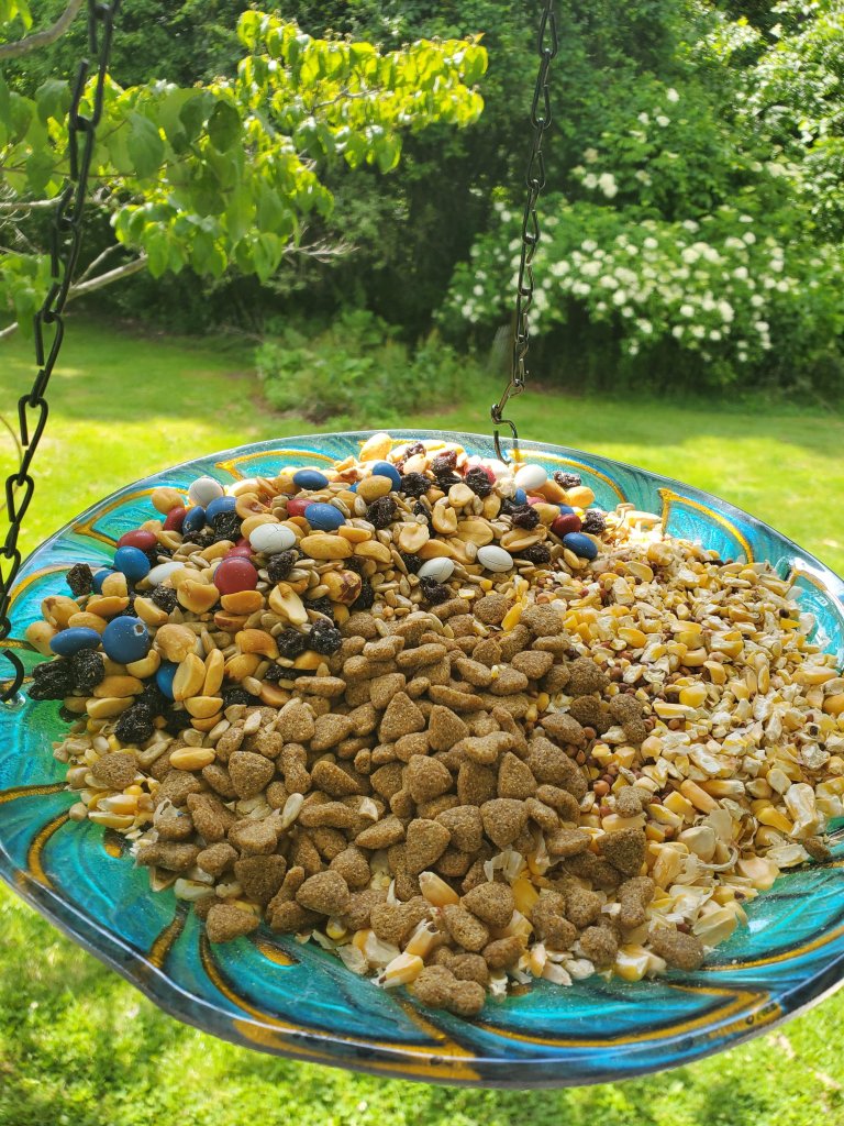 I am in my early summer teacher cleaning/organizing frenzy, and I found a bag of trail mix in my stuff so today the birds get some raisins, peanuts, and sunflower seeds mixed into their catfood (starlings and bluejays love catfood) and regular birdseed mix!